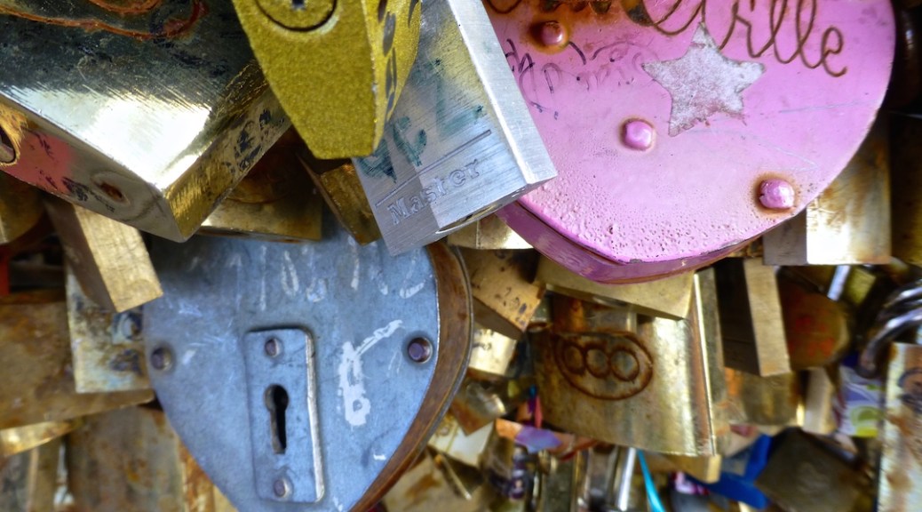 Alan was a total sport and indulged me in some even more uber-cheesy Parisian romance (slash a silly tourist trap): we placed a lock on Pont des Arts (the love lock bridge) and threw the key in the River Seine. It is truly insane how many locks are fitted onto that little bridge. And there are entire sections that are clipped and covered with wood so you can’t attach more. I’ve read that they regularly clip the locks as they get put up, and it looks like it must happen often since most of the dated locks had looked like they were from no earlier than August of this year. People go all out, too. Our €2, purchased a half block away from the bridge, standard lock was certainly outdone by some of the personally engraved, heart shaped masterpieces up there.