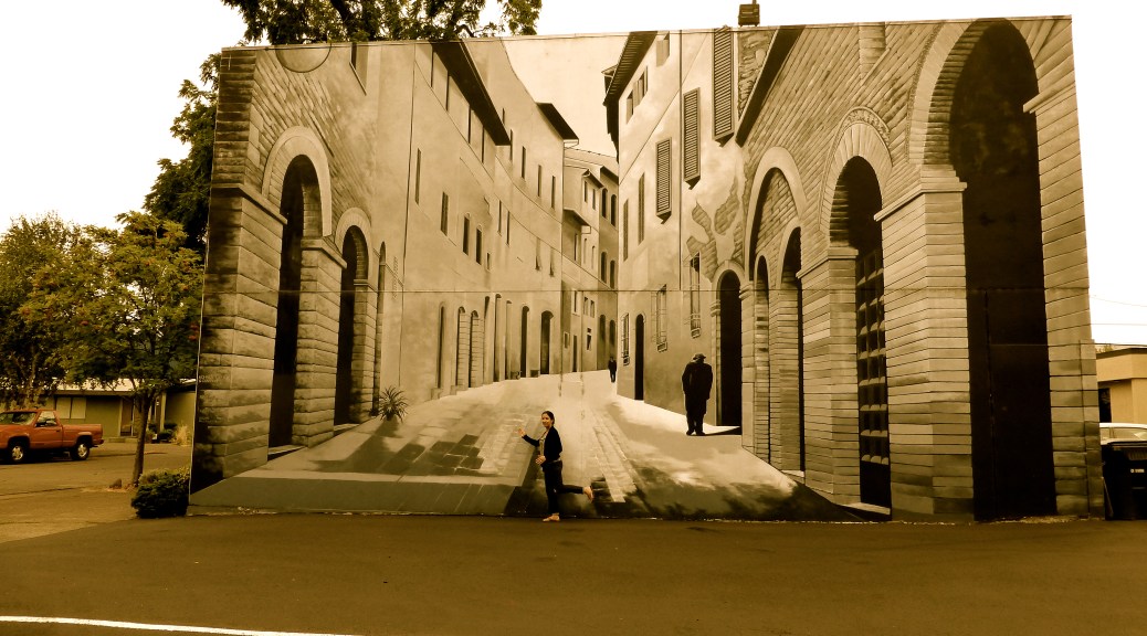 The Pearl District is Portland’s most upscale, nearby downtown and loaded with fine dining, bars and shopping. We walked South and then East to the riverside park for a bit before circling back to the full block of food trucks between 9th and 10th Avenues and Washington and Alder Streets. Portland is famous for food trucks, many organized in pods and seeming a bit more permanent than those in LA which truly move around constantly. There is another cluster we saw at 3rd and Washington and across the river on the Eastside they are everywhere, often found in little parking lots and at times accompanied by live music. Though it was tough, we passed up the panoply of options covering lots of Thai, Indian, Middle Eastern, Fijian, waffles, BBQ, Mexican, Georgian (the country), etc. Instead, I ordered a sandwich at Lardo and brought it to Jenni’s table around the corner at Grassa (same owner). My pork belly with heirloom tomato, arugula and caper mayo on ciabatta was delicious and very reasonable at $8, and Jenni loved her rigatoni with braised pork and an iced tea for $10.